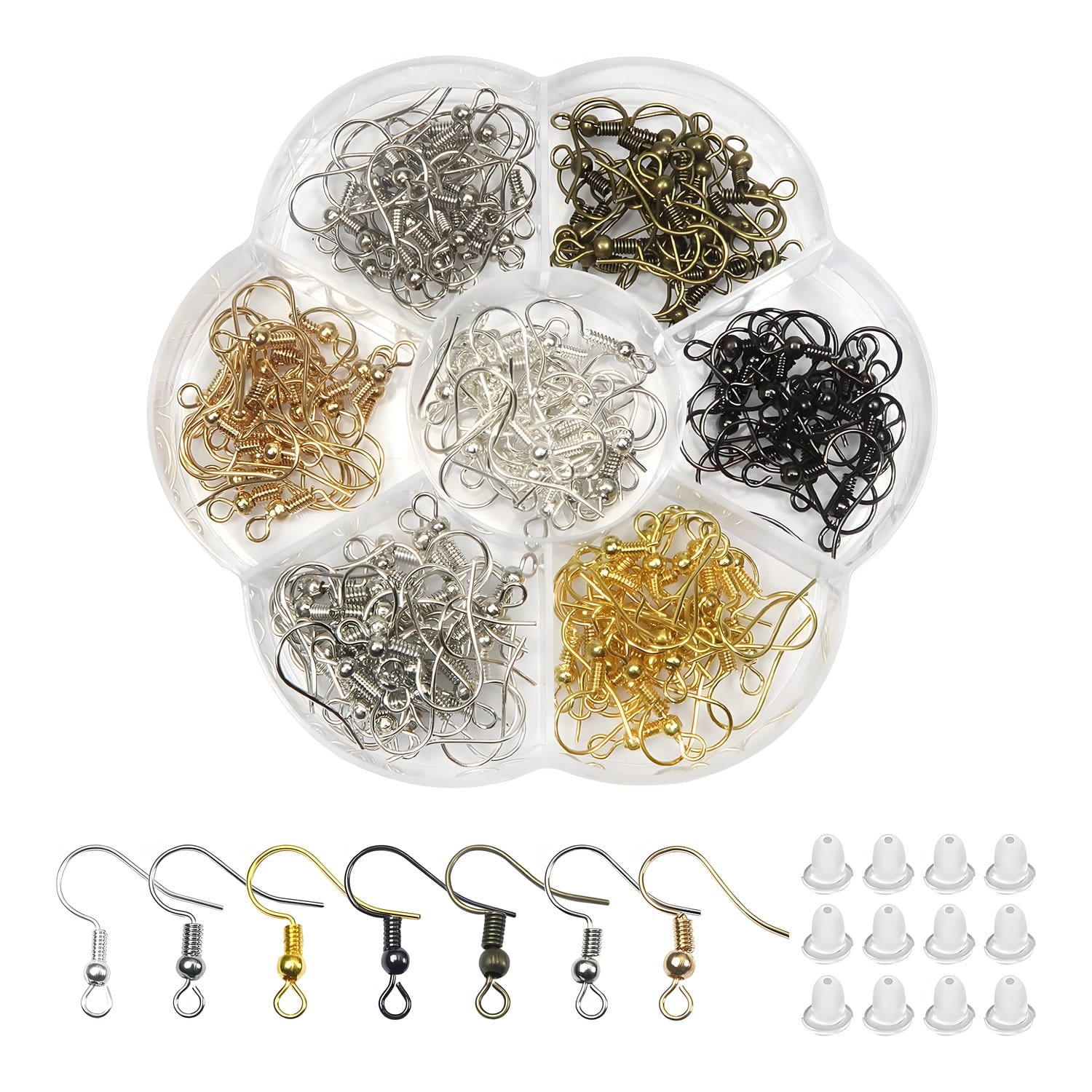 Zestaw 140 haczyków do kolczyków wykonanych z miedzi pokrytej srebrem 925, z dodatkowymi silikonowymi zatyczkami. Zawiera 7 klasycznych kolorów, idealnych do tworzenia biżuterii o różnorodnym stylu.