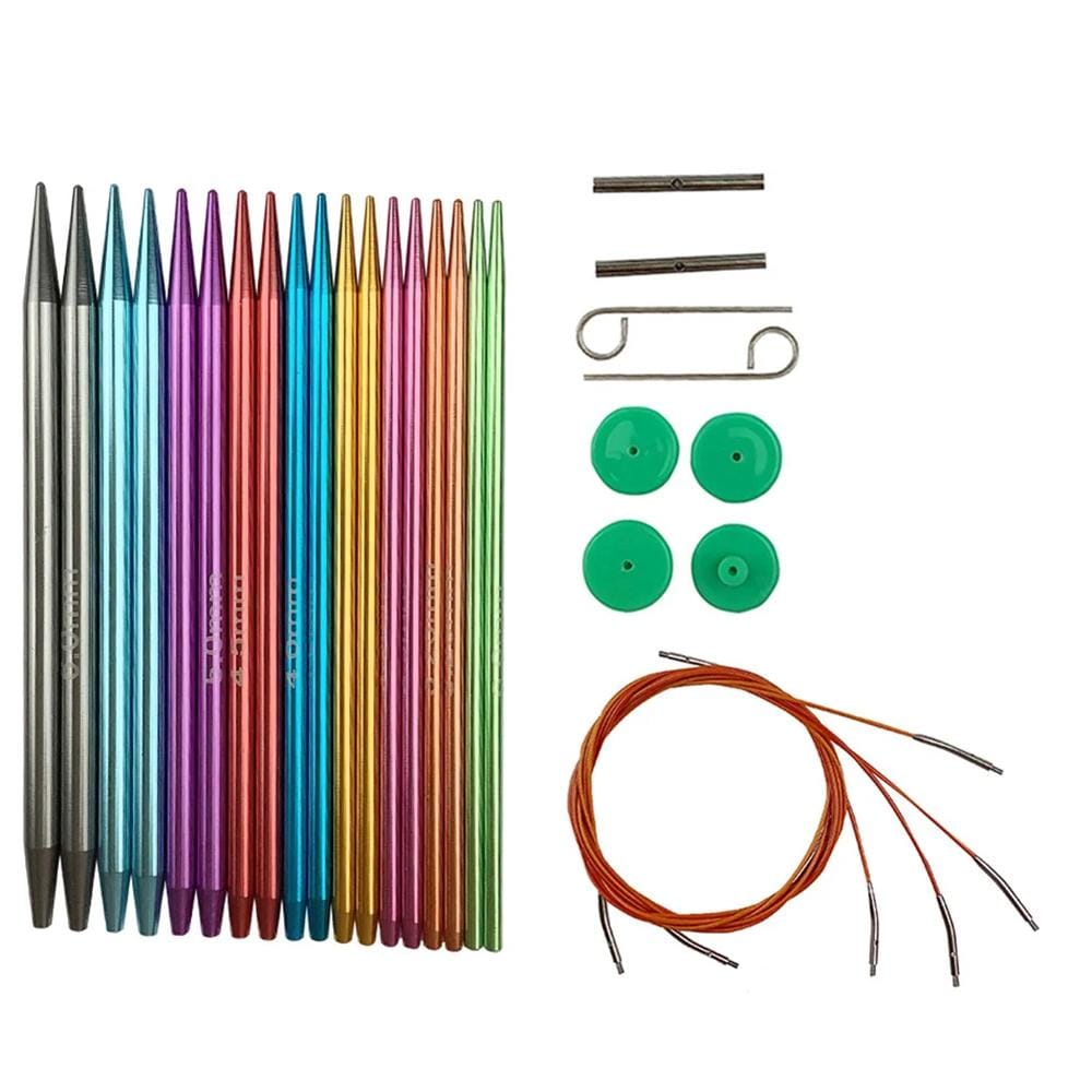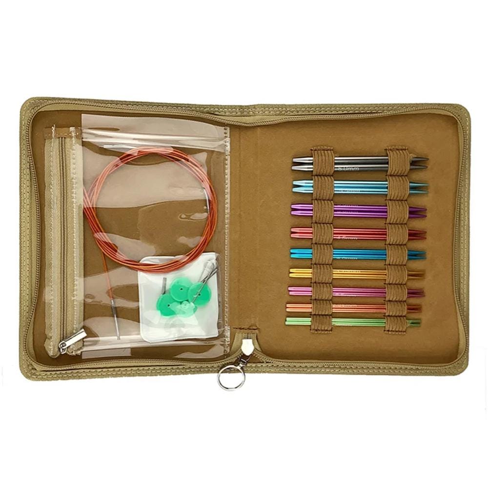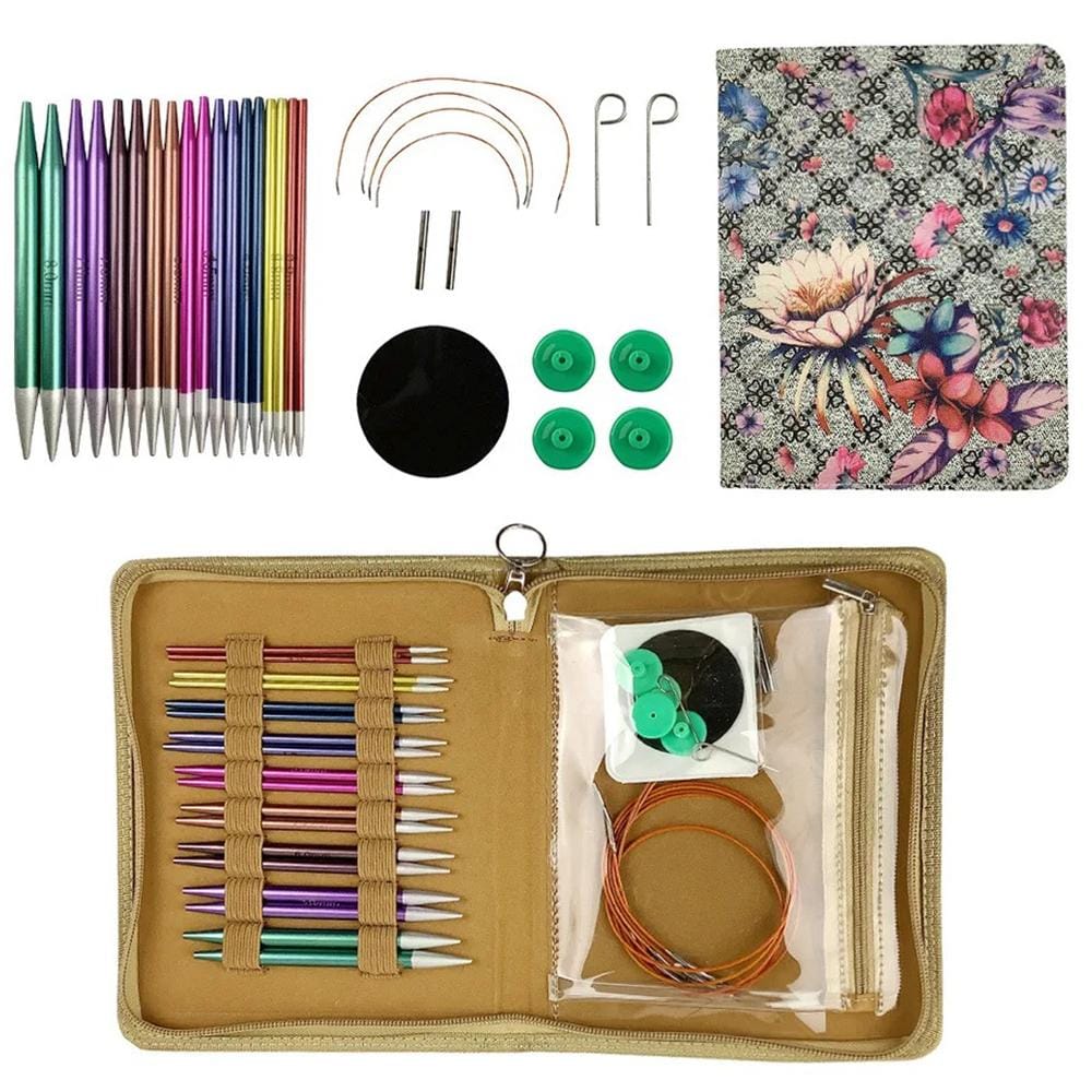 Zestaw zawiera 9 par aluminiowych drutów o długości 10 cm oraz cztery żyłki o różnych długościach. Do zestawu dołączone są także niezbędne akcesoria, a całość zapakowana jest w eleganckie etui. To doskonały wybór dla miłośników robótek ręcznych, zapewniający wygodę i precyzję pracy nad różnymi projektami dziewiarskimi.