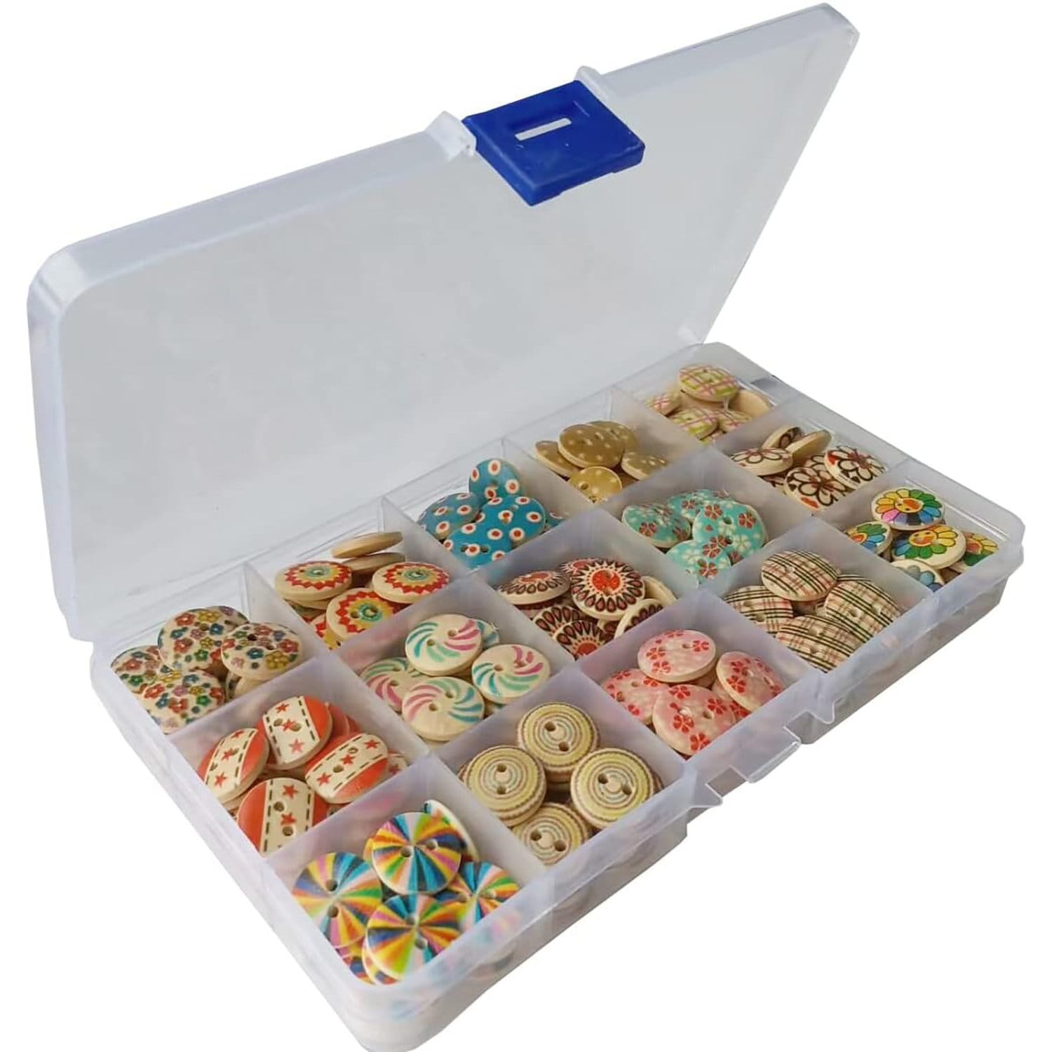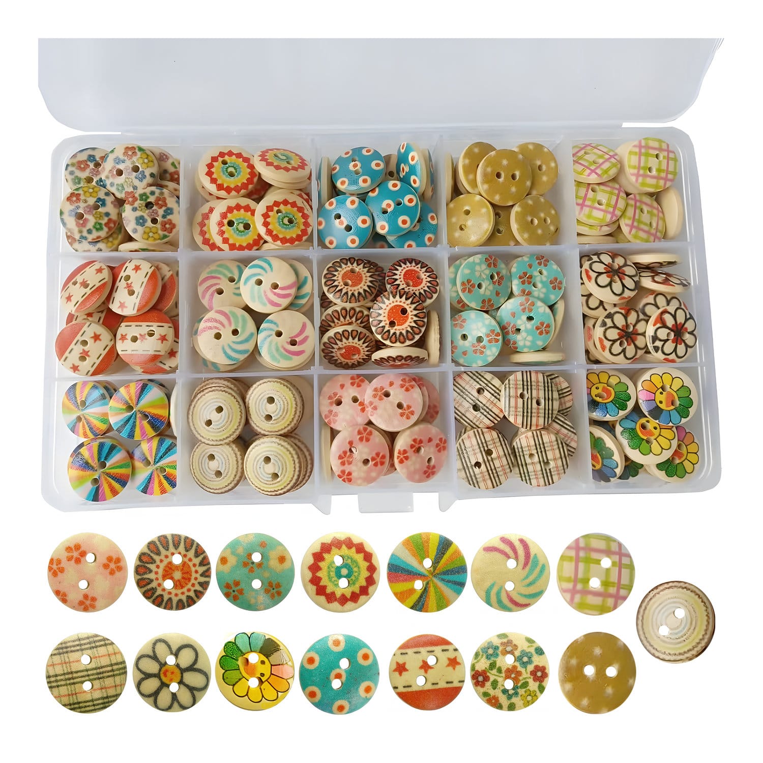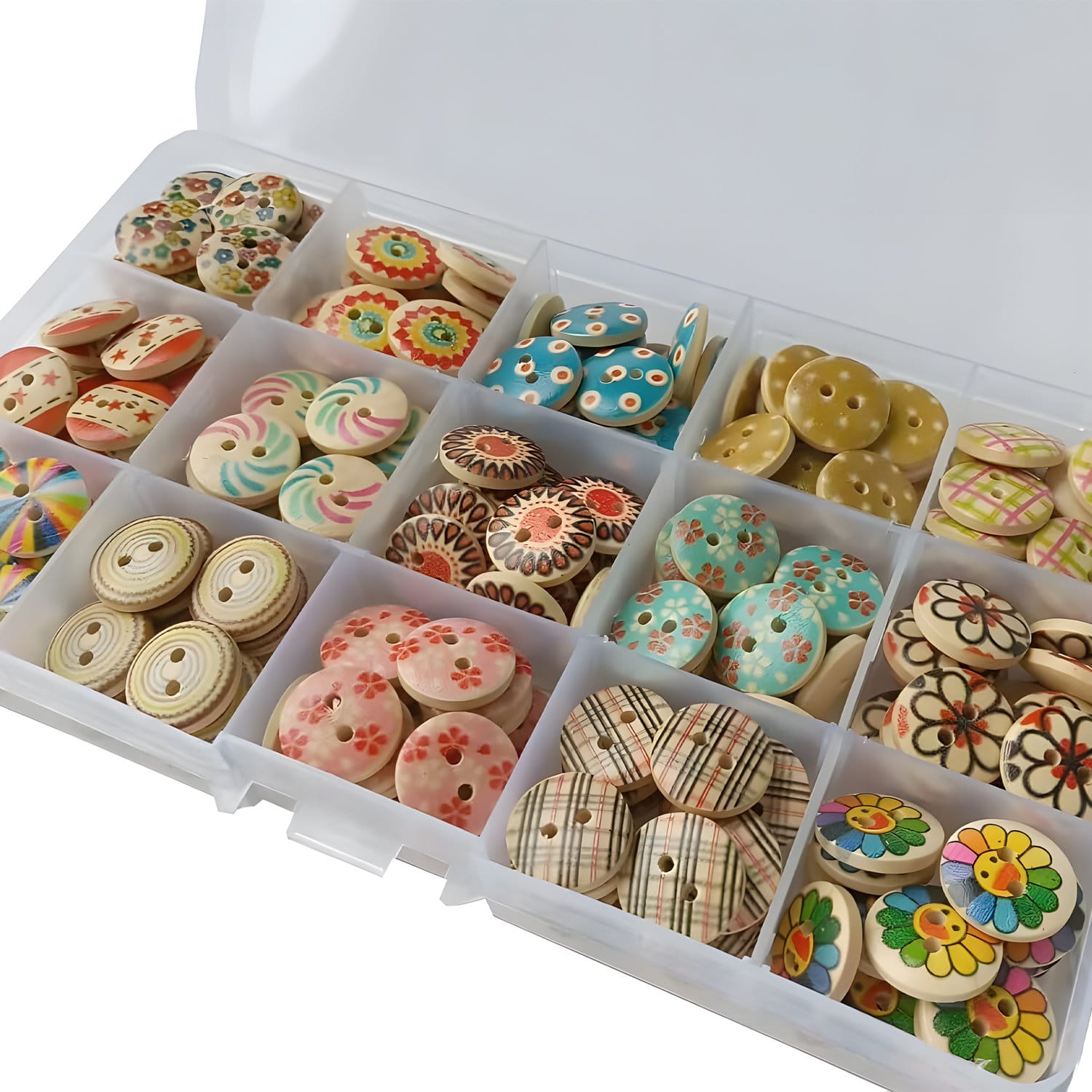 Bogaty zestaw do rękodzieła: Zawiera aż 225 drewnianych guzików w 15 unikalnych wzorach. Idealny do różnorodnych projektów DIY – od szycia po dekoracje i biżuterię.