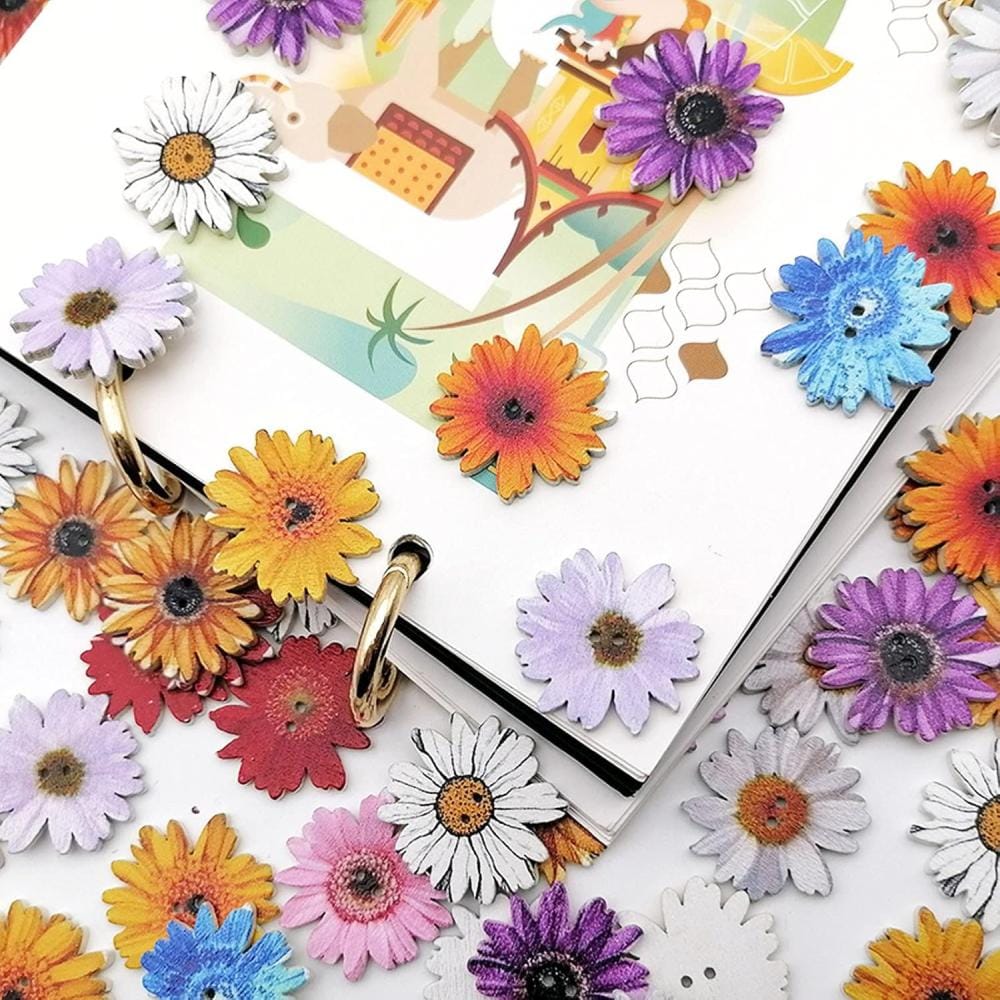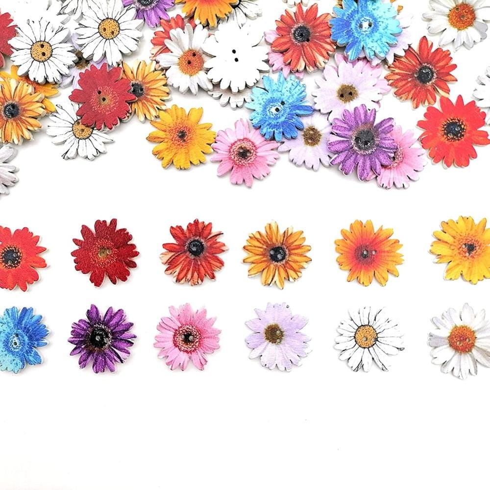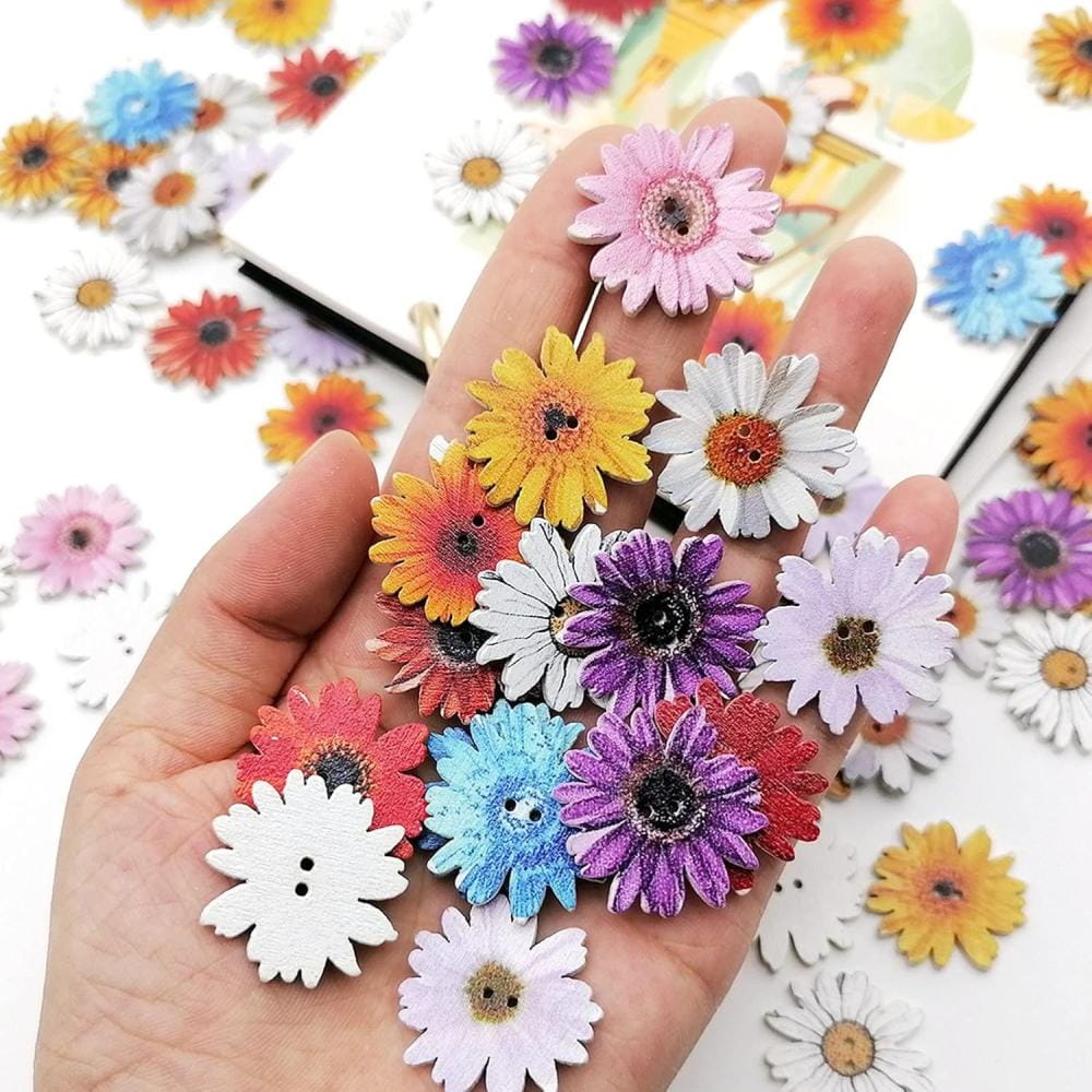 Zestaw 100 drewnianych guzików kwiatów: Otrzymujesz aż 100 kolorowych guzików w kształcie stokrotek – idealnych do różnych zastosowań dekoracyjnych i krawieckich.