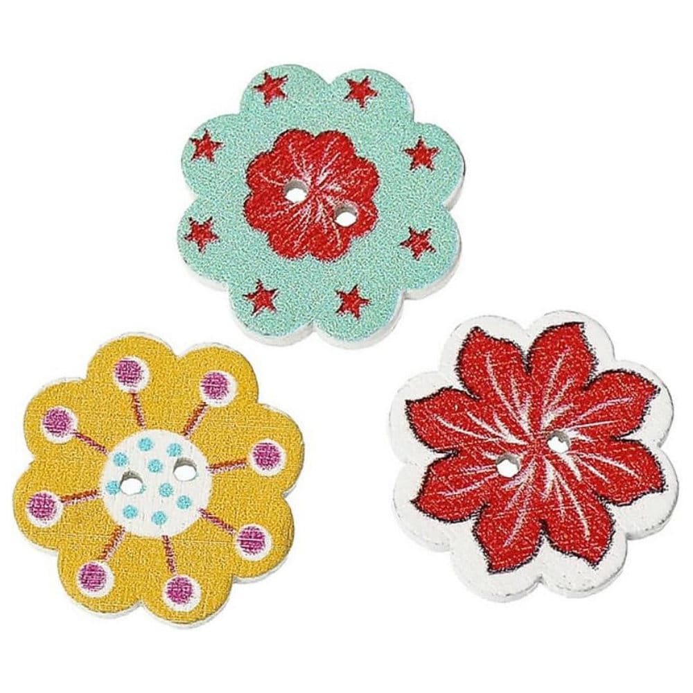 Kolorowe, drewniane guziki w kształcie kwiatów to doskonały dodatek do projektów rękodzielniczych. W zestawie znajduje się 50 sztuk guzików o średnicy 20 mm, każdy z unikalnym wzorem i barwną stylistyką. Sprawdzą się w szyciu, scrapbookingu, zdobieniu kartek czy przy ozdabianiu ubrań i dodatków.