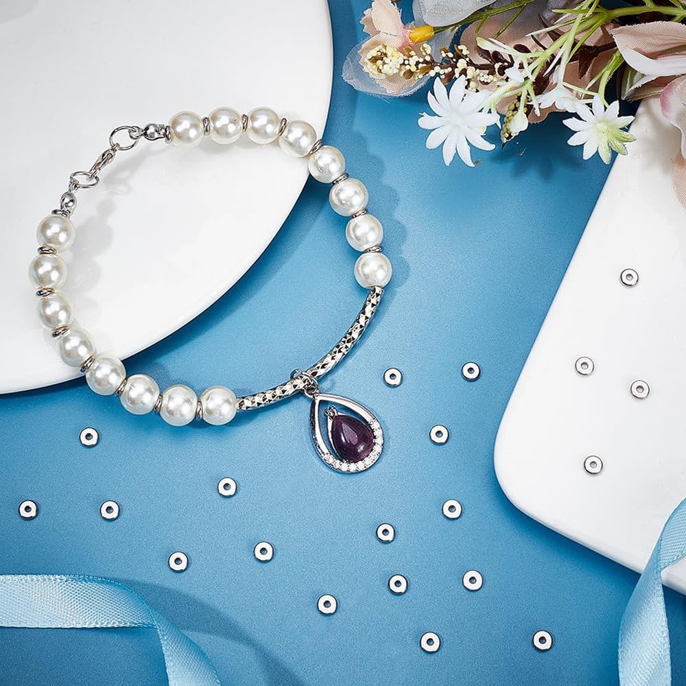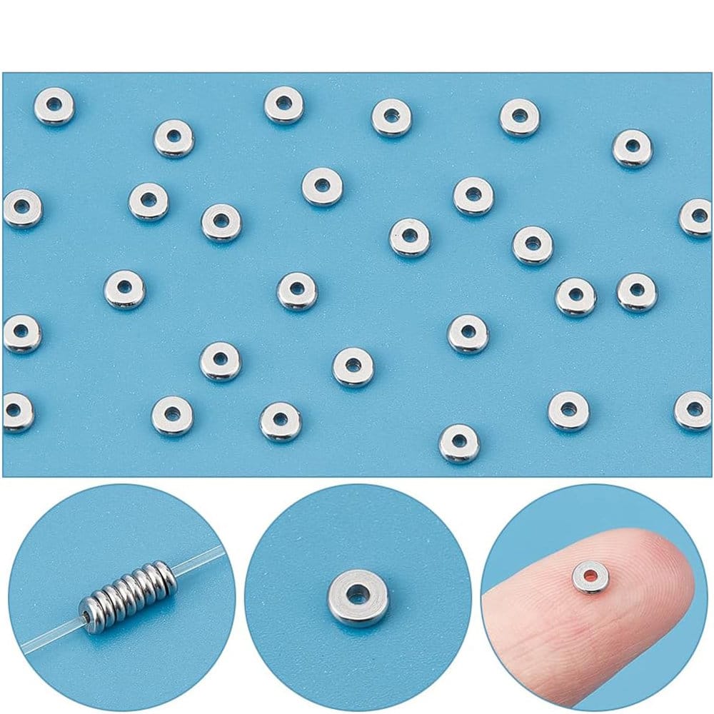 Zestaw około 100 płaskich koralików dystansowych wykonanych ze stali nierdzewnej to idealny wybór do tworzenia biżuterii DIY. Gładkie, błyszczące i trwałe – stanowią doskonałe uzupełnienie naszyjników, bransoletek czy kolczyków, nadając im elegancji i porządku.