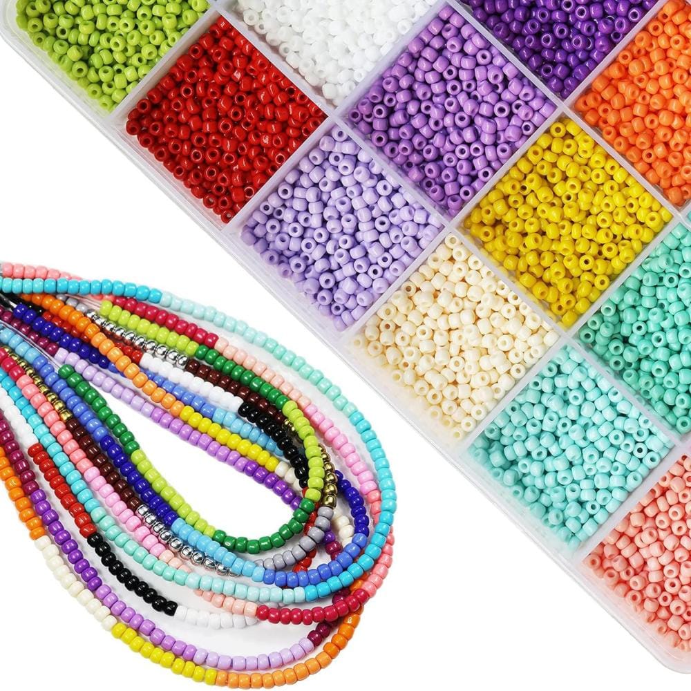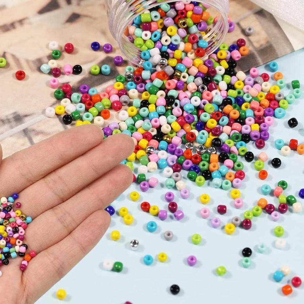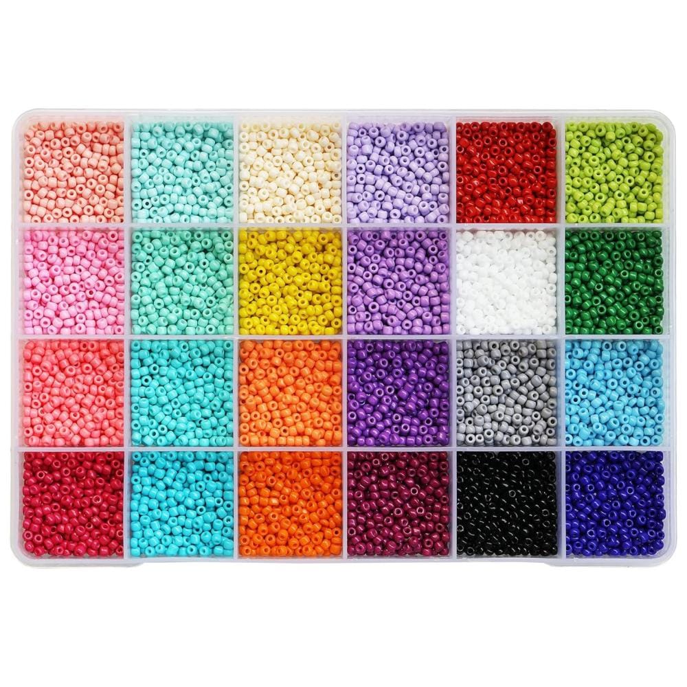 Zestaw 7200 koralików szklanych typu Seeds o średnicy 3 mm w 24 różnych kolorach. Wykonane z wysokiej jakości szkła – trwałe, odporne i idealne do rękodzieła. Doskonałe do tworzenia biżuterii, ozdób, dekoracji odzieży czy innych projektów DIY.