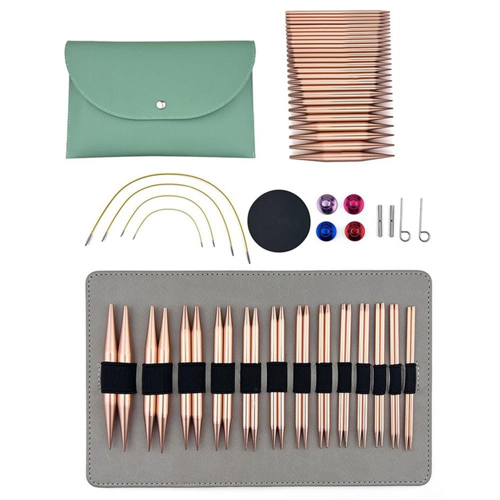 Zestaw wymiennych drutów do dziergania z miedzianym wykończeniem to połączenie stylu, funkcjonalności i wygody. W komplecie znajdują się 13 par końcówek, 4 elastyczne żyłki, praktyczne akcesoria montażowe i eleganckie etui w pastelowym kolorze.