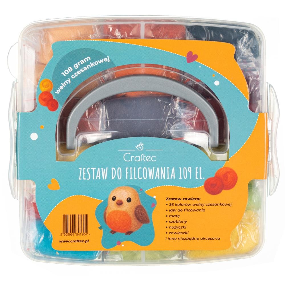 Zestaw do filcowania Craftec zawiera aż 109 elementów, idealnie dobranych do potrzeb początkujących i zaawansowanych. W zestawie znajdują się różnorodne materiały i narzędzia, takie jak 36 kolorów wełny czesankowej, igły o różnej grubości, formy, akcesoria do dekoracji.
