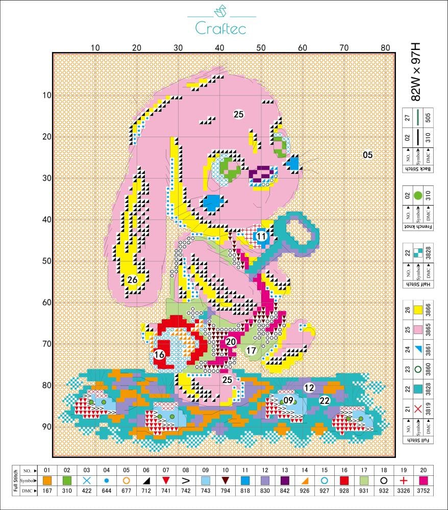 Czytelny nadruk – wzór jest kolorowy i podzielony siatką, a każdy ścieg oznaczony symbolem. Dzięki temu łatwo odczytasz, jaki kolor i rodzaj ściegu należy zastosować.