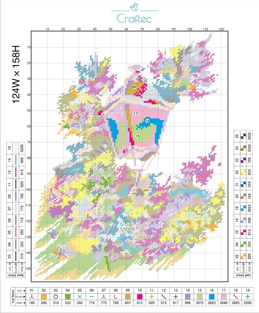 Czytelny nadruk – wzór jest kolorowy i podzielony siatką, a każdy ścieg oznaczony symbolem. Dzięki temu łatwo odczytasz, jaki kolor i rodzaj ściegu należy zastosować.