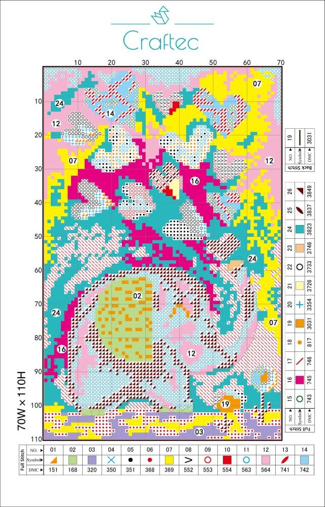 Czytelny nadruk – wzór jest kolorowy i podzielony siatką, a każdy ścieg oznaczony symbolem. Dzięki temu łatwo odczytasz, jaki kolor i rodzaj ściegu należy zastosować.