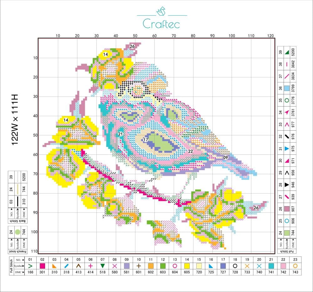 Czytelny nadruk – wzór jest kolorowy i podzielony siatką, a każdy ścieg oznaczony symbolem. Dzięki temu łatwo odczytasz, jaki kolor i rodzaj ściegu należy zastosować.